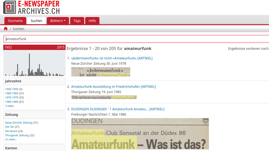 Meine erste Suche galt dem Stichwort «amateurfunk» und siehe da, einige Antworten dazu erscheinen in der Auswahl.