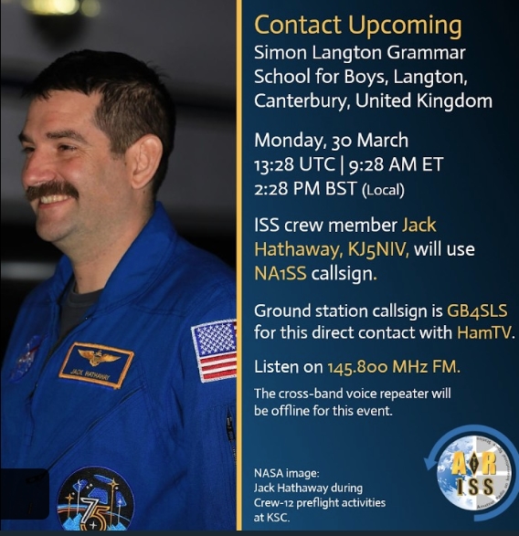 Am Montag, dem 30. März 2026, findet ein spannender ARISS-Einsatz statt, der auch für Schweizer Funkamateure von Interesse ist. Der Astronaut Jack Hathaway (Rufzeichen KJ5NIV) wird die Amateurfunkausrüstung an Bord der Internationalen Raumstation (ISS) betreiben. Im Rahmen des ARISS-Programms (Amateur Radio on International Space Station) wird er live mit der „Simon Langton Grammar School for Boys» in Canterbury, Vereinigtes Königreich, in Verbindung treten.