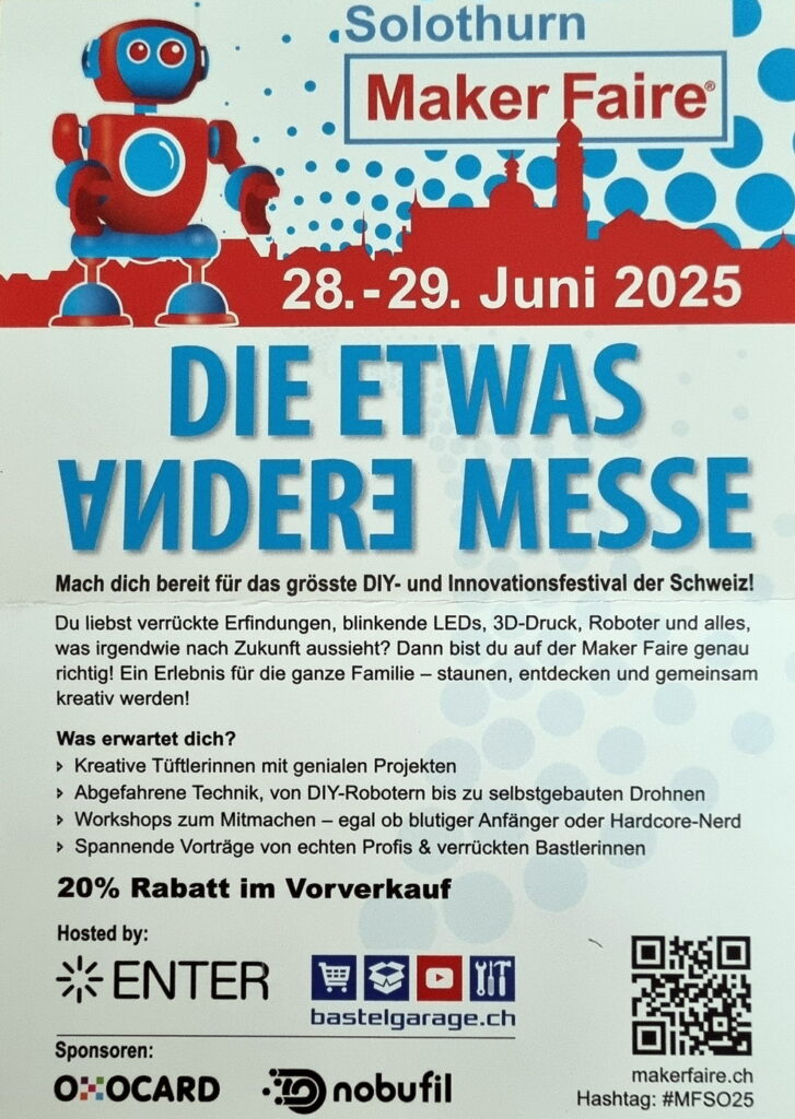 Mach dich bereit für das grösste familienfreundliche DIY- und Innovationsfestival der Schweiz! Die Maker Faire Solothurn 2025 kommt und bringt Kreative, Erfinder und Technikbegeisterte (und solche die es werden wollen) aus allen Ecken des Landes zusammen.